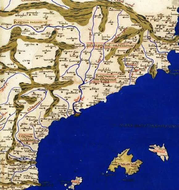 1497. Mapa de l'edició incunable de la Geographia o Cosmographia de Claudi Ptolemeu. Detall de la península ibèrica ja una mica més ben acatxapada en aquesta edició, feta amb els topònims medievals. |