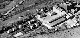 Vista de la fàbrica d'adobs nitrogenats «Sociedad Ibérica del Azoe», després «Cros», que hi hagué a peu de carretera de Barcelona. Al costat, els xalets dels capatassos. Segons comentà Victoriano Muñoz, enginyer, a la revista «Labor» allà als anys 50: