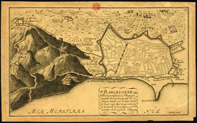 | 1700 ca. BCN, «Barcelonne ville et port fameux d'Espagne capitale de la principauté de Catalogne» (BNP). Mapa anterior al 1714, amb la ciutat encara sense la Ciutadella militar espanyola que serà construirà pel Borbó per sotmetre-la des de llevant. |