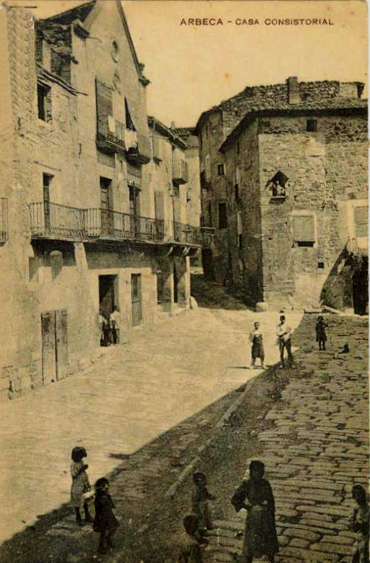 | Anys 1910-20. Arbeca, les Garrigues. Façana de l'antic ajuntament arbequí amb un dels pocs carrers empedrats. |