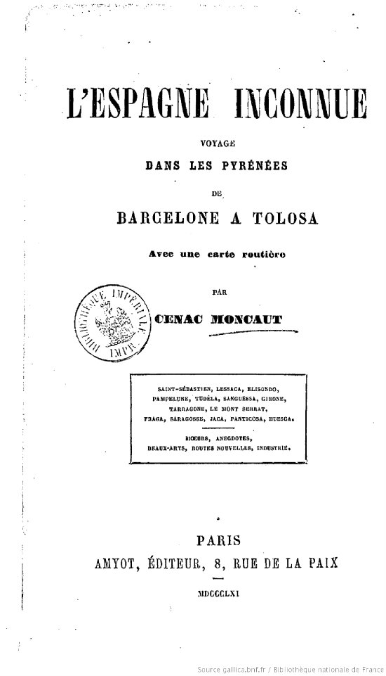 | 1861. «L'Espagne inconnu» (Gallica). Portada de l'edició francesa. |