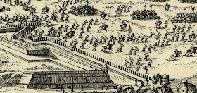 Detall dels reforços gavatxos per a la defensa de la vila, amb les hosts castellanes emplaçades a l'altra banda del riu.