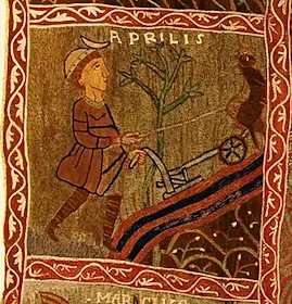 A l'abril (APRILIS), temps de conreu, amb un llaurador amb l'arada estirada per dos bous o cavalls.