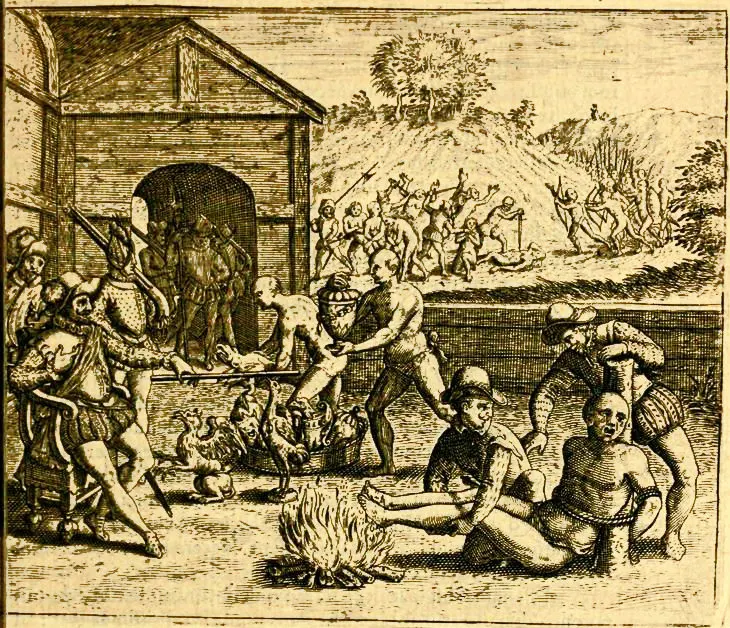 Els turments dels conqueridors espanyols a les Amèriques. Per a la lectura de la descripció que en féu el pare Bartomeu Casaus, veg. edició ms. d'Antonio Lacavalleria, Barcelona, 1646 (BNE). |