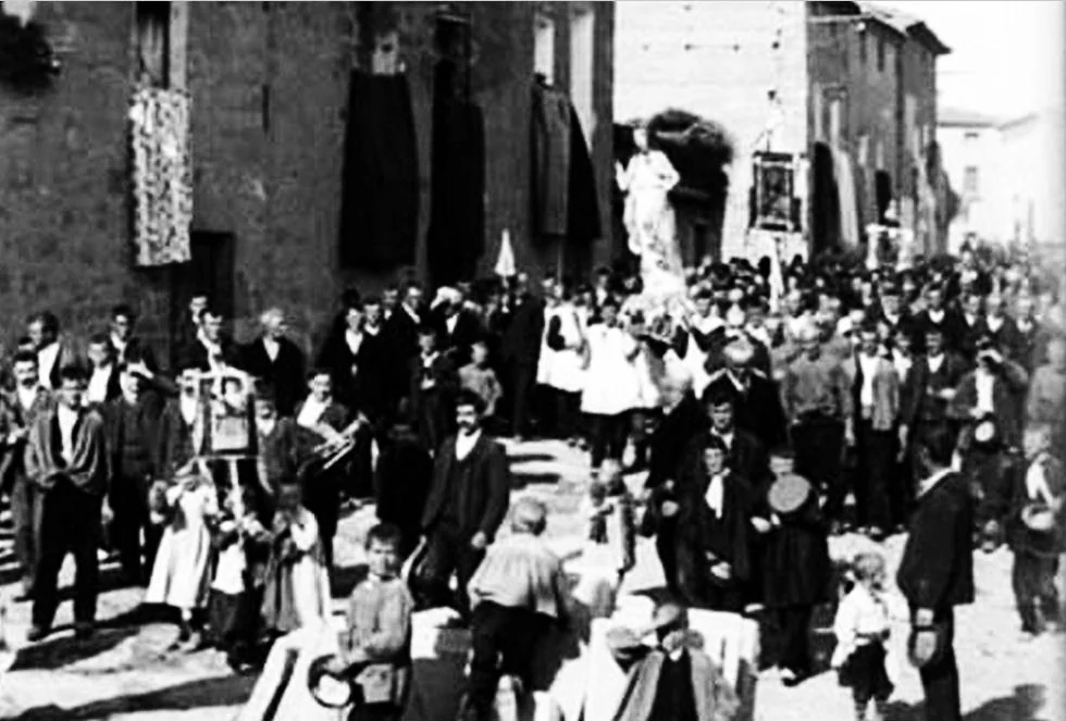 | 1909. Artesa de Lleida, Fot. Josep Massot i Palmés (AFCEC). Magnífica imatge de la processó, potser per la Mare de Déu d'Agost. Els enormes domassos penjats dels balcons semblen de color negre, però potser eren més aviat granats. |