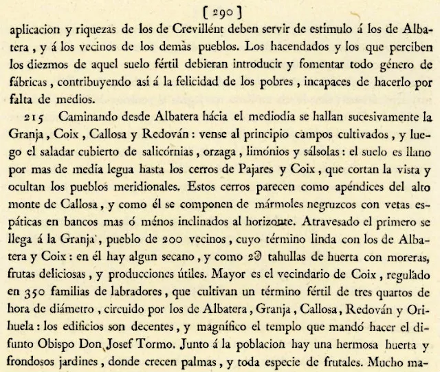 Descripció de la costa i dels penyals, i referència a la llacuna a «cinco leguas al sureste de Orihuela», ara connectada amb l'aigua del mar, «que mezclada con la de lluvia y cristalizada después por el ardor del sol desde Mayo hasta fines de Julio rinde quantiosas sumas. Para conducir el agua del mar al fondo de la salina se excavó un canal... con poco desnivel, por donde corre el agua por su propio peso a ocupar la hondonada...»