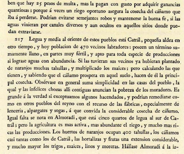 Catral. Se'n destaca la «suma simplicidad en las casas del pueblo, la qual y las infelizes chozas allí contiguas anuncian la pobreza de los moradores. Es grande a la verdad si exceptuamos algunos grandes hacendados...» |