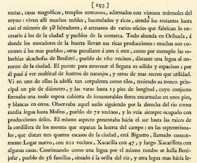 A Oriola, «el puente para atravesar el Segura es sólido i espacioso; por él pasé a ver multitud de huertos de naranjos...» Descripció de la part meridional del Baix Segura, fins a Guardamar, «último pueblo de la huerta,... con calles en cuesta y edificios muy ordinarios; fue antiguamente población mut respetable, mas decayó... padeció después las menguas que otros pueblos por la expulsión de los moriscos, y guerras que siguieron hasta la de sucesión...» S'hi destaca la plantació de tarongers, hortalisses i fruiters de tota mena. |