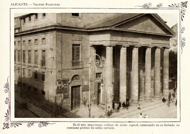 | 1910 ca. Alacant. «Portfolio fotográfico», Albert Martín, ed. (Europeana). El Teatre Principal d'aires clàssics o «coliseo de dicha capital, ostentando en su fachada un suntuoso pórtico de estilo románico». |