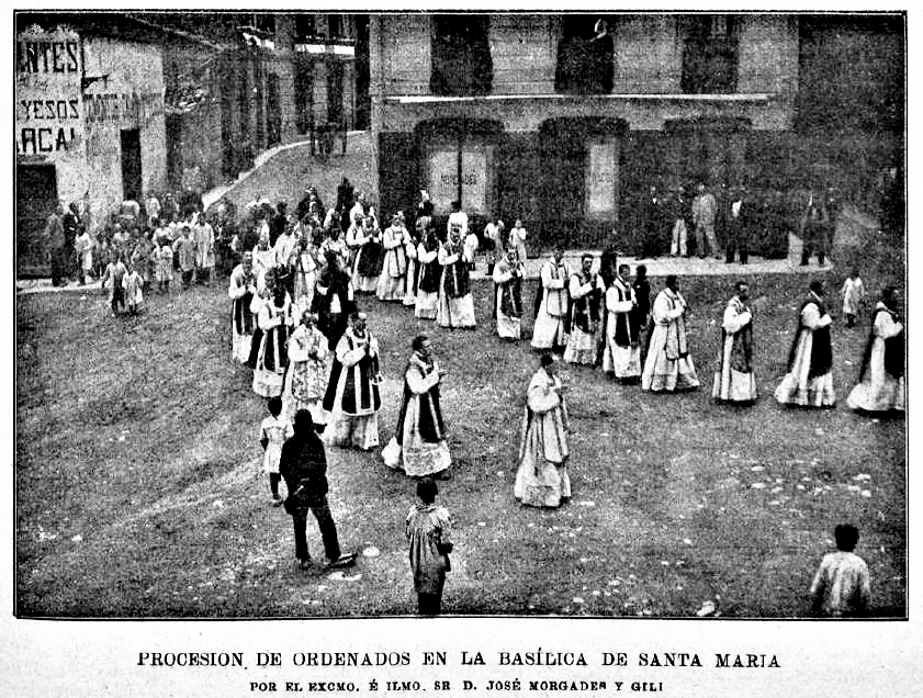 | 1889. Monestir de Ripoll. «La Hormiga de Oro», 30 de setembre (BDH). El Bisbe de Vic, Josep Morgades i Gili, en una processó d'ordenats. |