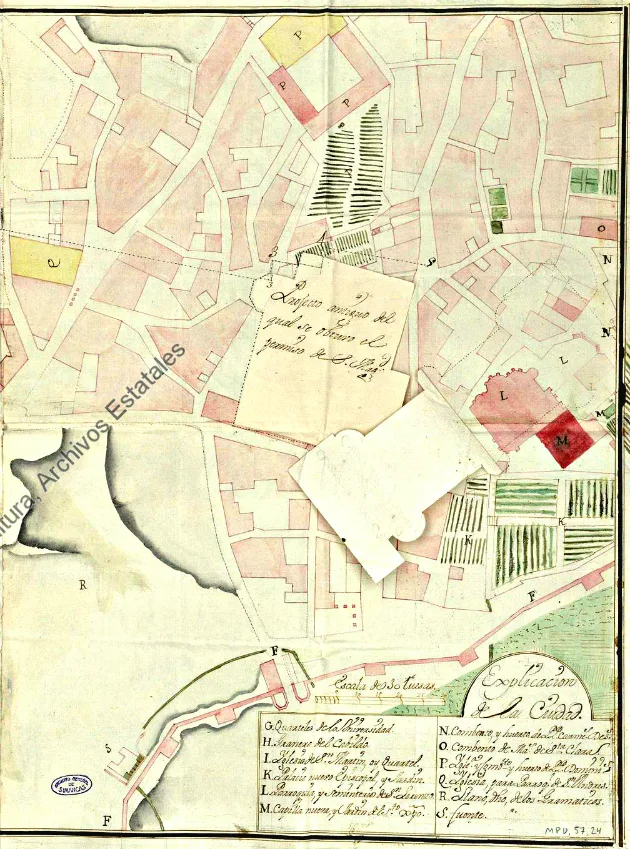 | 1742. Plànol de Lleida al Set-cents. La muralla (F) que pujava de Boters i tancava per Sant Martí, que tenia nombroses torres de fortificació. |