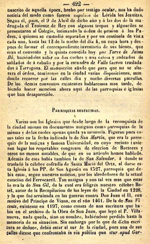 la de Sant Martí, antiga parròquia de la Universitat lleidatana, «en cuyo recinto tuvieron lugar los respetables congresos de elección de Rectores...»