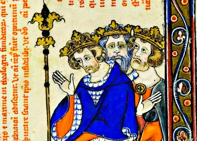 Escuts heràldics de França, Catalunya (encara sense nombre fix de barres) i l'antic escut angeví de Sicília, anterior a l'ocupació catalana de 1282 de Pere II el Gran.