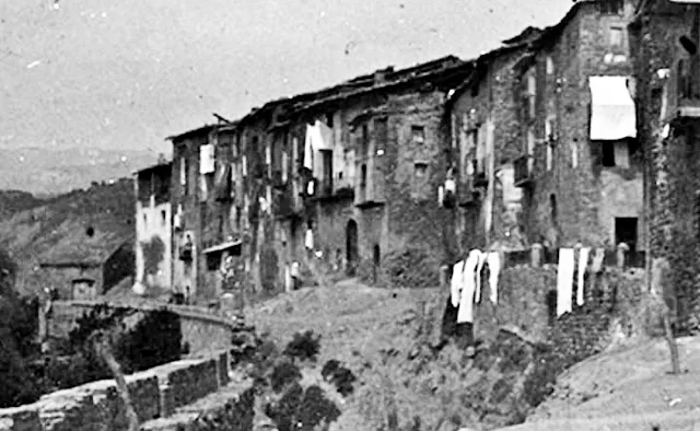 | 1920. Salàs de Pallars (el Pallars Jussà). Foto: Josep Salvat i Blanch (1866-1929), (BdC-MDC). Detall de l'antic raval del Vall, i de les dones i nenes rentant la roba, que transportaven en cossis per estendre-la als balcons i galeries de casa. |