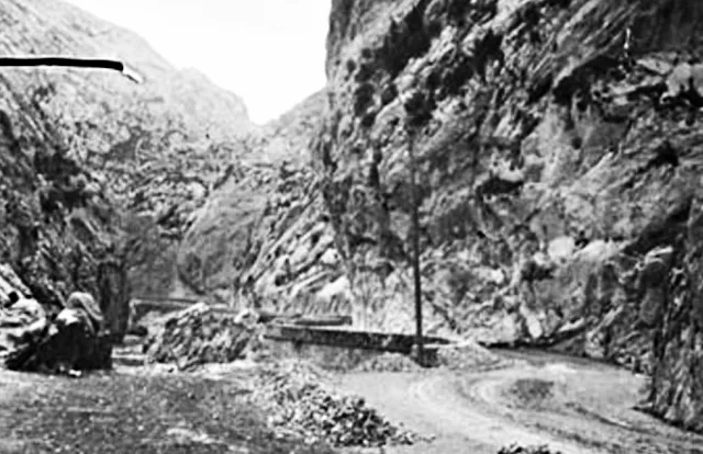 | 1913. Congost dels Tresponts (l'Alt Urgell). Foto: Cèsar August Torras (1852-1923), (MDC-AFCEC). Els retombs serpentejant de la nova carretera. Encara s'hi observen munts de runa de la construcció, però no hi ha encara les torres elèctriques que pujaran la llum del pantà de Sant Antoni al Pirineu. |