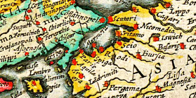 Detall de Constantinoble, dels Dardanels i de la Mar Negra o Pontus Euxinus. La denominació de 'Pont Hospitalari' podria ésser d'un eufemisme per encobrir el significat contrari, 'hostil, inhòspit', per la dificultat de navegar-hi a causa de l'estat de les aigües i de les antigues tribus salvatges dels encontorns. Un cop colonitzat pels milesis i integrat a la civilització grega, el nom esdevingué positivat.