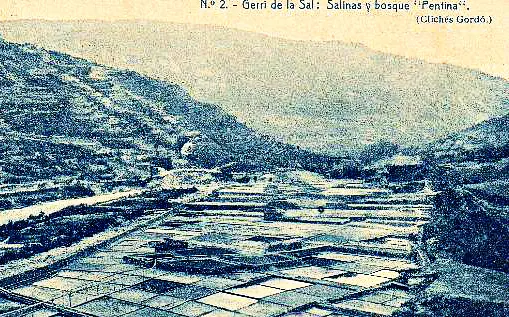 | 1900 ca. Gerri de la Sal (el Pallars Sobirà). Foto: Thomas. La data de circulació de la postal és del 1903. La vista, dels salins i eres a l'arribada a la població. amb la vila al fons, sempre amb el gran casalici del magatzem de la sal, l'Alfolí reial, destacant dalt del poble per sobre de les altres teulades. S'hi aprecia com el vell pont romànic descansava suaument sobre la marge esquerra de la Noguera. |