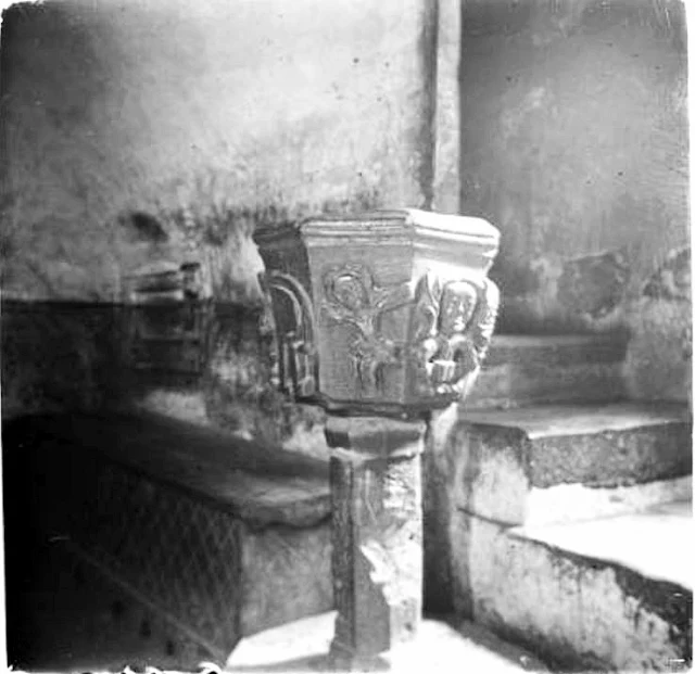 | 1920. Isona, la Conca Dellà (el Pallars Jussà). Foto: Josep Salvany i Blanc (1866-1929), (MDC-BdC). L'antiga pica baptismal de l'església d'Isona, tallada en pedra |