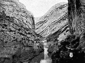 A la Noguera Pallaresa, el congost de Terradets. La foto, probablement del mateix autor (que deixà nombroses primeres imatges dels llocs que recorregué) és segurament uns quants anys més antiga, i s'hi observa el vell pont medieval trencat per alguna riuada passada, amb la passera de fusta que connectava tots dos costats, el de Camarasa, al sud i a la dreta, i el septentrional de Castell de Mur. Aquells anys, des de 1912, la Canadenca havia obert la carretera per permetre el pas de la maquinària del pantà de Sant Antoni.