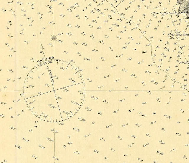 Detall de la moderna rosa dels vents del mapa, amb indicació del nord magnètic.