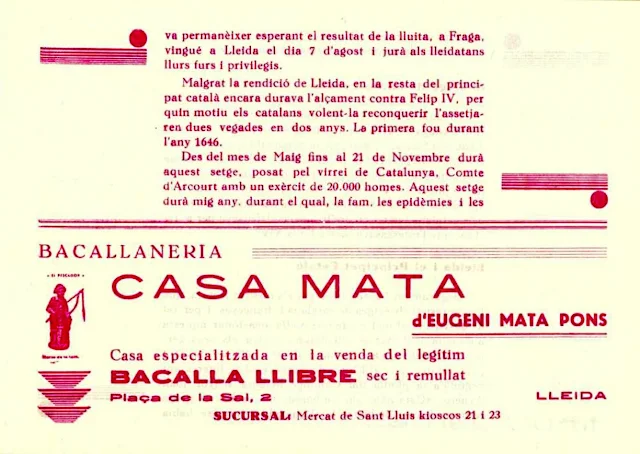 | 1935. Festa Major de Primavera, Lleida (Fons Sol-Torres, UdL). Finalment, «la definitiva reconquesta de Lareda estava reservada als catalans per mitjà del comte de Barcelona, Ramon Berenguer IV el Sant, el qual tancà amb la presa de Lleida el gloriós període de la restauració catalana». No: encara faltava l'expansió meridional i mediterrània. L'anunci de la botiga de queviures i tocineria de Ramon Farré al carrer Carme. |