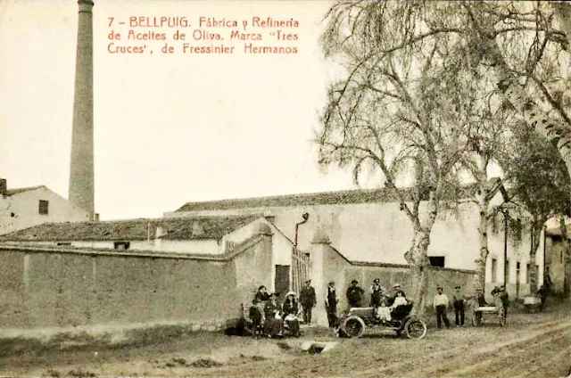 | Anys 1900-10. Lo Molí d'oli Fressinier, Bellpuig d'Urgell. «La fábrica Fressinier. Una industria química en el Vinaròs de principios de s. XX», d'Enrique Fressinier i Roca, Associació Cultural Amics de Vinaròs, 2006 (enllaç). La primera oficina d'aquesta família provençal s'instal·là a Tortosa al 1887 i a la dècada que ve ja s'inicià la producció d'oli a Bellpuig, centre d'una gran comarca productora d'oli de gran qualitat i que, per mor de la carretera directa a Reus que recorria bona part de les Garrigues i travessa pel dret el Priorat fins a la capital exportadora (al Soleràs sempre hi ha hagut el carrer dit de la Carretera de Bellpuig), de seguida tenia sortida als mercats. Per tant, probablement a inicis dels 90 del segle XIX començà a funcionar aquest gran molí, que amb el temps arribà a donar feina fins a 25 persones. Cap al 1900, la família amplià l'empresa a Vinaròs amb una planta de tractament de la pinyola, per tal d'obtindre'n aiguardent, un procés que comportava certs tractaments químics dels residus oleícoles. Allà, el nom dels amos fou adaptat de seguida com a Freixenet, molt més pronunciable a la valenciana. No sabem si això també passà a Bellpuig, i si el cognom originari fou també adaptat a la lleidatana. Però és prou enraonat. La imatge del molí bellputgenc és superba. No només perquè ens mostra el pati interior amb els munts de pinyolada que esperaven per ser traslladats a Vinaròs, sinó perquè ens permet de veure, per damunt dels teulats dels coberts, l'edifici de l'església del poble, vist des de darrere, ço és, des de la banda est o nord-est de la població. La proximitat al poble era tan gran, que el molí era a continuació de les mateixes cases del carrer del camí de les Tres Creus, que ara se'n diu Carrer de Sant Josep, que dona continuïtat al que puja de l'ajuntament amunt (i antiga carretera o camí ral arbrat a banda i banda a què es refereixen alguns visitants al segle XIX), i a on ja no hi queda cap rastre de l'antic molí olier, ni dels vells plataners que ombrejaven els passants. |