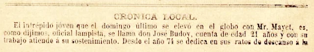 | 1900. L'aeronauta Budoy a Lleida. «La Vanguardia», de 28 de juny (ARCA). Tres o quatre setmanes després de la defunció d'en Budoy i mes i mig després del darrer vol, el globus «Ciudad Condal» tornava a solcar els aires. La vídua, és clar, se'l degué vendre per assegurar-se l'anar fent, i algun altre «intrépido sucesor del capitán Budoy», sense nom encara a la crònica, li pendria el relleu. The show must go on, o 'marxa Ton, que el qui es queda ja es compon'. |