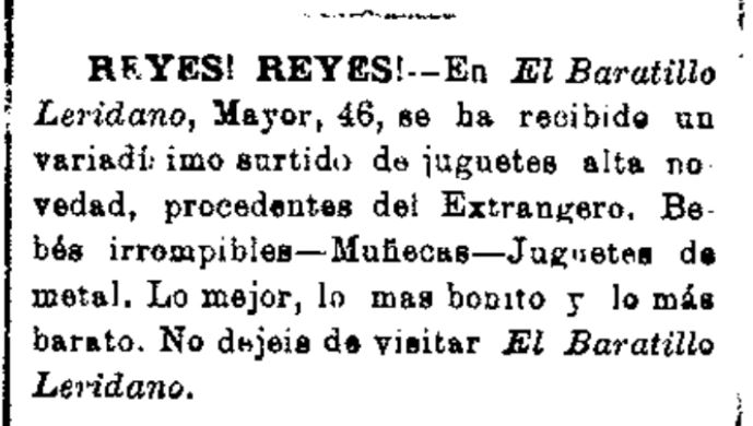 Lo Baratillo de Salvador Cañadell en un anunci a la premsa local d'una mena de rebaixes o liquidació d'estiu. Hi veiem que no s'hi venien només joguines, sinó també p.ex. altres articles per a la llar. Els «bebes» s'hi oferien prou barats: suposem que volia dir ninos i nines de joguet.