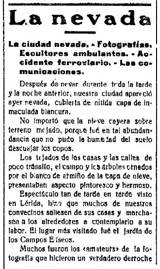 La notícia de la nevada del febrer del 1916, que motivà que els lleidatans sortissin al carrer a gaudir de la neu. S'hi explica com molts se n'anaren a passejar pels Camps Elisis o com tots els fotògrafs locals agafaren les càmeres per immortalitzar el moment. Alguns també es dedicaren a fer estàtues de neu en llocs prou concorreguts, com ara davant del Cafè d'Europa pel costat de la banqueta (de Fernandito). En aquells temps, com en el nostre, el mal temps feia sortir les vergonyes de les instal·lacions i obres públiques.