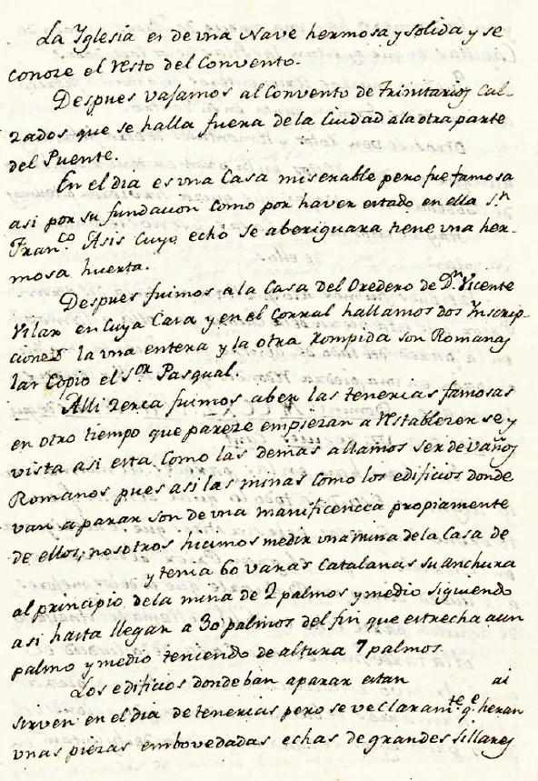 Seguidament, visita al convent dels Trinitaris, a fora el pont, conegut per la llegenda que Sant Francesc d'Assís hi també hi passà... i per una gran horta adjacent. Com devia ser de gran i guapa per tal que l'autor en fes esment! Després d'una visita a una casa particular per examinar un parell d'inscripcions que li semblaren romanes, la comitiva que acompanyava l'autor es dirigí als antics banys romans, «pues así las minas como los edificios donde van a parar son de una manificencia propiamente de ellos». Llavors, però, no feien pas de banys, sinó de «tenerías», o sia, d'adoberies per treballar la pell, ofici que requeria abundós cabal d'aigua.