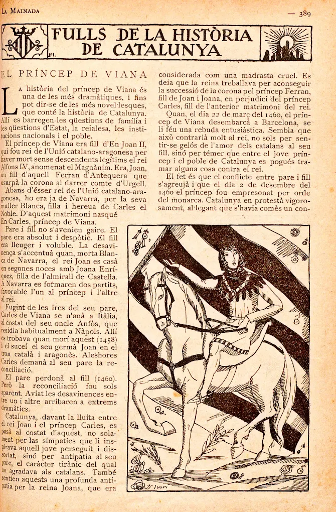 Portada de la revista: «Estava adreçada a una classe benestant i contenia seccions variades entre les quals no faltaven articles d'història de Catalunya i d'exaltació de la pàtria.» (enllaç).