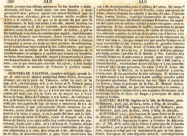 «Separada de la mar per un cordó litoral d’uns 8 km, originalment els aiguamolls ocupaven una superfície d’unes 2 600 ha en un perímetre de 32 km. Alimentada per torrents diversos (el d’Almadrà i el de Sant Miquel) i l’aqüífer de Sa Pobla, a l’estiu és inundada en part per l’aigua de la mar. La vegetació és típica de maresma (salicòrnies, joncs, canyars, tamarius, oms, àlbers, etc) i té una gran riquesa ornitològica (flamencs, agrons, arpelles, fotges, nombroses espècies d’anàtides i de moixons, etc). El 1863 la societat britànica New Majorca Land Co. obtingué la concessió per a emprendre la dessecació del marjal. Hi construí, a més, una xarxa de canals centrada pel Canal Gran (2,5 km de longitud × 50 m d’ample), 50 km de camins i un moll. Les terres dessecades i bonificades passaren a la propietat de la companyia el 1871, però el fet que l’explotació agrícola fos poc reeixida, en part degut a les infiltracions i la salinització, que propiciaren el ressorgiment dels aiguamolls, determinà la dissolució de la companyia (1896) i la venda de l’Albufera a J. Gual de Torrella, el qual la vengué el 1938 a Cel·lulosa Hispànica SA, que n'explotà els canyars per a la fabricació de paper.