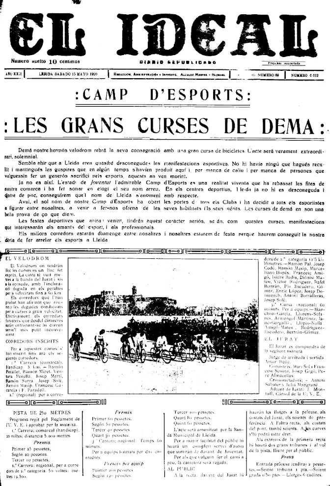 Ja ho diu la crònica: «demà nostre hermós velòdrom rebrà la seva consagració amb una cursa de bicicletes». No hi diu inauguració, sinó consagració, la primera gran efemèride ciclista que s'hi feia. Hi havia eufòria esportiva a la ciutat, a causa de les magnífiques instal·lacions republicanes: «L'estadi de Joventut, l'admirable Camp d'Esports, és una realitat viventa... En els centres esportius, Lleida ja no hi és desconeguda, i dintre de poc aconseguirem que el nom de Lleida s'anomeni amb respecte». És clar que això té alts i baixos històrics: ara anem avall a marxes forçades, amb el penós espectacle del Lleida Esportiu, que ja ve de la penosa liquidació de la Unió Esportiva.