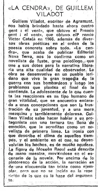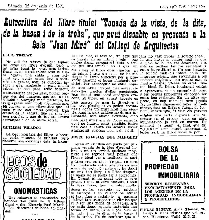 «Diario de Lérida», de 31 de gener (AML). En la crítica de l'exposició, s'hi rebaixa la categoria poètica de la poesia concreta a la de «grafismos parapoéticos», que és titllada de moda passatgera, arrelada en els cal·ligrames d'Apollinaire, «con los nuevos aditamientos de otros símbolos, como la combinación de póster-poema». Se'n destaca la força impactant de les composicions, «si bien es previsible que a la larga serán abandonadas por sus propios practicantes». El subtil menyspreu amb què l'anònim Ciudadano Equis obsequia els autors li fa pontificar que «Viladot es un magnífico escritor que no precisa de esta clase de propaganda para ser conocido».