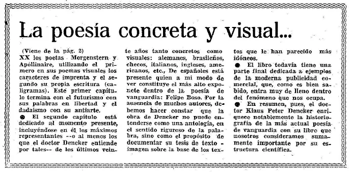«Diario de Lérida», de 23 de gener (AML). La novetat de la poesia concreta era absoluta. A la redacció del diari van recórrer al volum VII del Diccionari Salvat, pàg. 320 per resumir-ne la idea per als lectors. En destaca com a elements definitoris: la conjunció visual i fonètica, l'ús de la tipografia (unitària o seriada), ús de símbols de codis comunicatius, valoració del signe semàntic, valor intrínsec de l'espai de disposició del poema, integració d'altres arts com la fotografia, el disseny, el gravat.