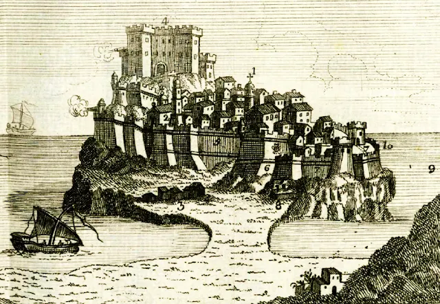 La Catedral (1) sempre escortada per Sant Feliu (2), encara amb el campanar presentat com a acabat, tot i que mai no va finir-se per error en els càlculs constructius, i el famós llamp que se'n sol donar com a causa només en degué escapçar algun pinacle, segons que he llegit en algun lloc. El dibuix també marca el Palau Episcopal (3), el col·legi tridentí (4) i el convent dels Caputxins (5) i el campanaret del convent dominicà (6) just a tocar de la muralla fortificada.
